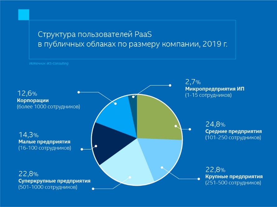 Основными потребителями услуг PaaS в России являются компании с числом сотрудников от 100 до 1000 – суммарно средние, крупные и суперкрупные предприятия занимают 70% рынка. Как отмечают эксперты, в России экосистемы PaaS в основном складываются вокруг якорного клиента и его партнеров. Причем ключевым пользователем, как правило, выступает материнская компания облачного провайдера и она же является его основным клиентом.