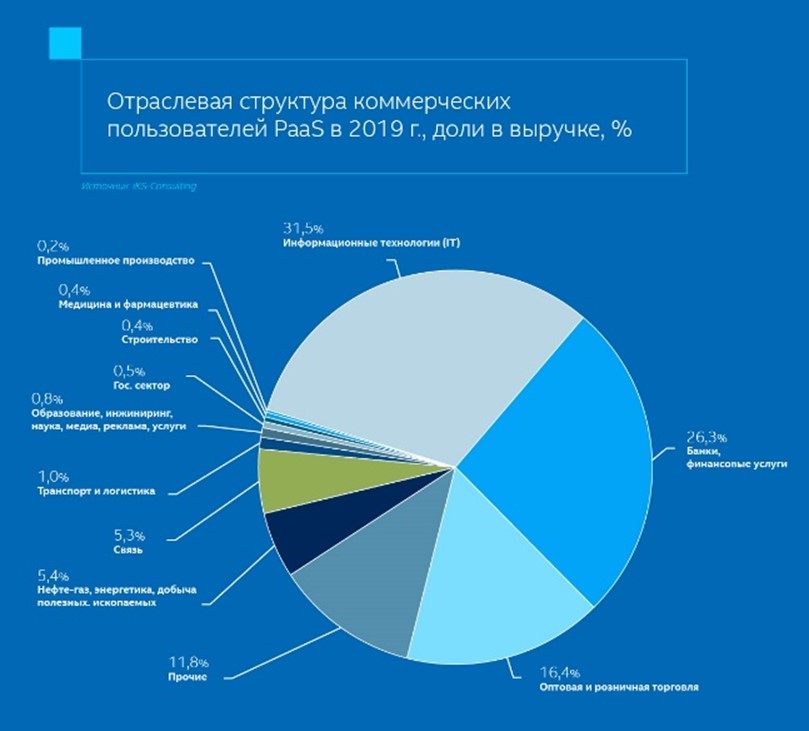 Что касается отраслевой структуры коммерческих пользователей PaaS, то максимальная доля зафиксирована у ИТ-компаний (31,5% рынка), за ними идут банки и компании, оказывающие финансовые услуги (26,3%), предприятия оптовой и розничной торговли (16,4%).
