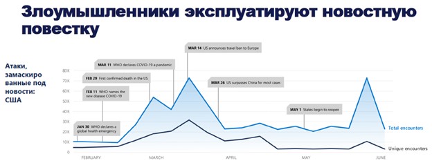Чем больше общество встревожено распространением COVID-19, тем чаще тема используется в качестве приманки во вредоносных кампаниях с применением социальной инженерии, включая рассылку фишинговых писем. Как сообщает Microsoft в своем отчете Digital Defense Report, за 2020 год компания заблокировала 13 млрд электронных писем с зловредным кодом, из них 1,6 млрд содержали URL-адреса, которые активируют фишинг-атаки, нацеленные на получение учетных данных. В США количество атак резко увеличивалось феврале, в день первой смерти от коронавируса и затем в день запрещения поездок из-за карантина в Европу.
