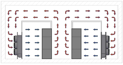 Рис. 2. Холодные стены забирают воздух из горячих коридоров и выпускают охлажденный воздух  в холодный бассейн