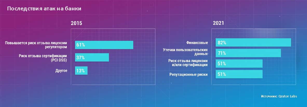 Сегодня основным последствием кибератак, как показало исследование «Защита от DDoS-атак в банках», недавно опубликованное Qrator Labs, большая часть (82% опрошенных) финансовых организаций считает собственно ущерб от действий злоумышленников. Однако еще шесть лет назад ситуация была иной. Тогда в фокусе внимания банков находилось выполнение зачастую формальных требований регулятора, и главную опасность кибератак они видели в повышении риска отзыва лицензии (61%) и риске отзыва сертификата PCI DSS (37%).