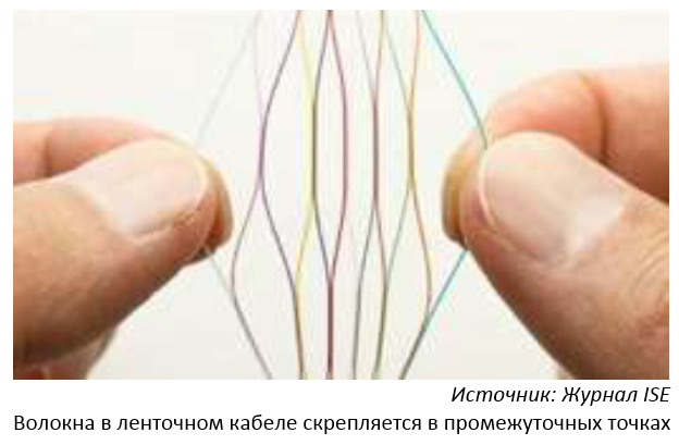 расположены с некоторым промежутком, образуя структуру, напоминающую паутину. Такая структура делает ленту более гибкой, позволяя загружать до 3456 волокон в один двухдюймовый (примерно 5 см) канал, что вдвое превышает плотность укладки кабелей с традиционной упаковкой волокон. Это также позволяет уменьшить радиус изгиба, что облегчает работу с новыми кабелями в стесненных условиях ЦОДа.