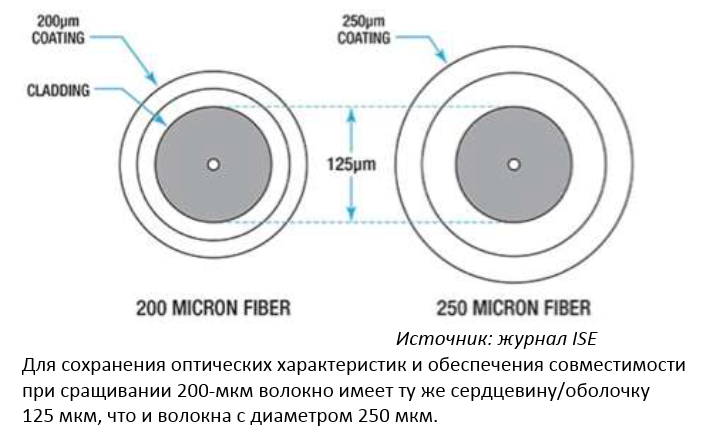 покрытие. В волокнах толщиной 200 мкм диаметр сердцевины, как и в