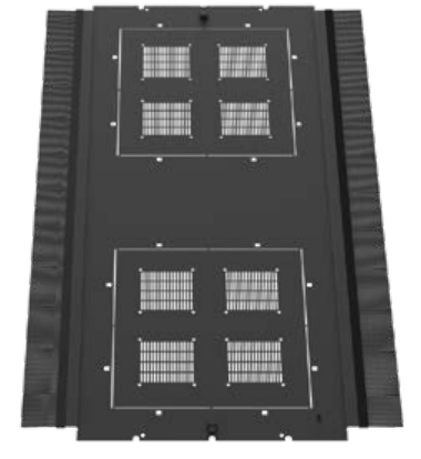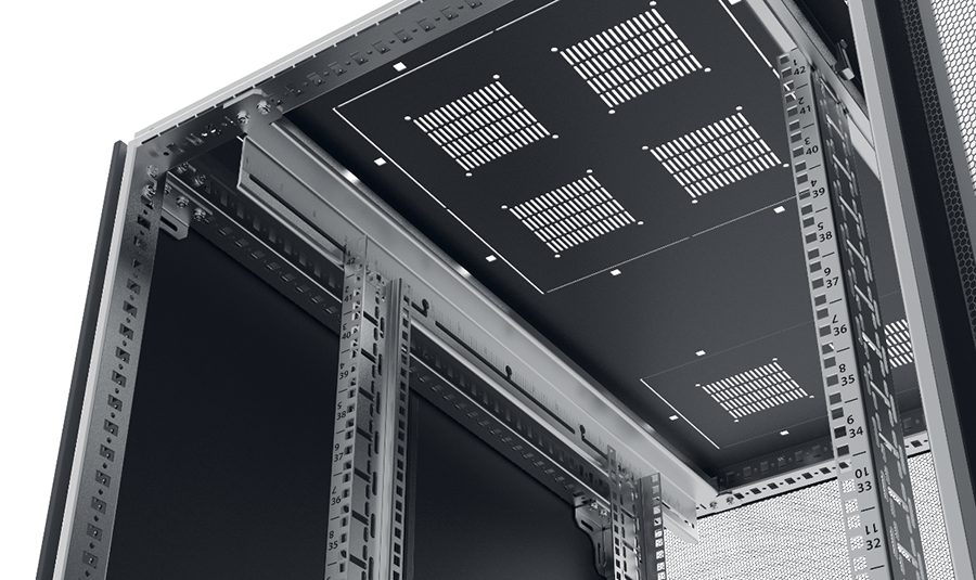Верхняя панель шкафа монтируется без использования инструментов. Выламываемые по всей глубине заглушки в верхней панели шкафа можно заменить на щеточные вводы, что обеспечивает ввод большого количества кабелей (до 4 тыс. линий симметричных кабелей U/UTP категории 6А). Причем верхнюю панель можно демонтировать, даже если кабели уже проложены.