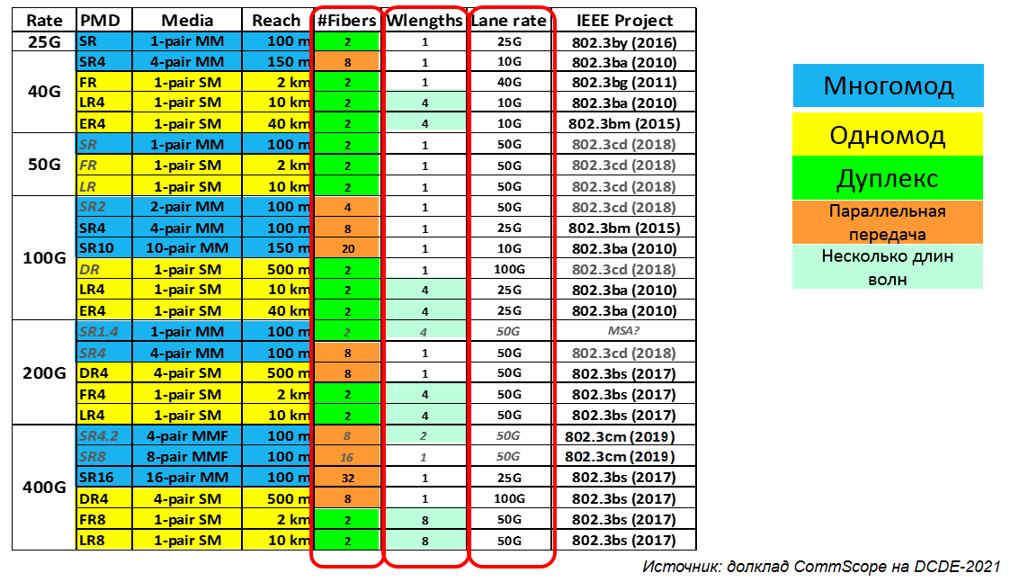 Когда в 2002 году появилась технология 10G Ethernet сценарий дальнейшего развития высокоскоростных технологий казался понятным, рассказывает Степан Большаков, ведущий менеджер по работе с клиентами компании CommScope. Оборудование 10GE работало по дуплексному протоколу (используется одна пара волокон), при этом предполагалось, что для достижения более высоких скоростей (40G, 100G) будет применяться параллельная передача с увеличением числа волокон. Но затем, когда передовые заказчики начали внедрять 40GE по параллельным протоколам, Cisco предложила дуплексный вариант 40GE, а потом и 100GE. Возникла ситуация, когда для одних и тех же скоростей стали использоваться как дуплексные, так и параллельные протоколы. В результате клиенты, которые уже использовали параллельные системы, стали переходить на дуплекс при миграции на более высокие скорости.