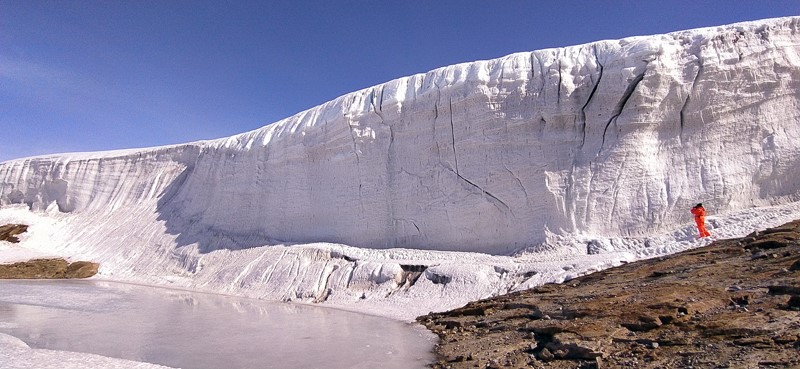Летом лед «скатывается» с ледникового щита и, врезаясь в шельфовый лед, переворачивает соседние льдины, образуя сложную поверхность шельфового ледника