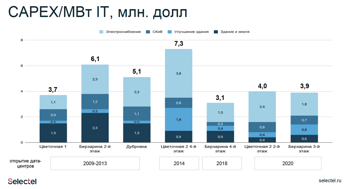 Одна из немногих компаний, которые опубликовали данные о стоимости своих ЦОДов, – компания Selectel. На недавно построенных объектах ей удалось снизить капитальные расходы до уровня $4 млн за 1 МВт. Впрочем, нужно учесть, что на объекте Берзарина (4-й этаж), удельные затраты на который оказались наименьшими, используется адиабатическое охлаждение с отказом от дорогостоящих компрессоров.