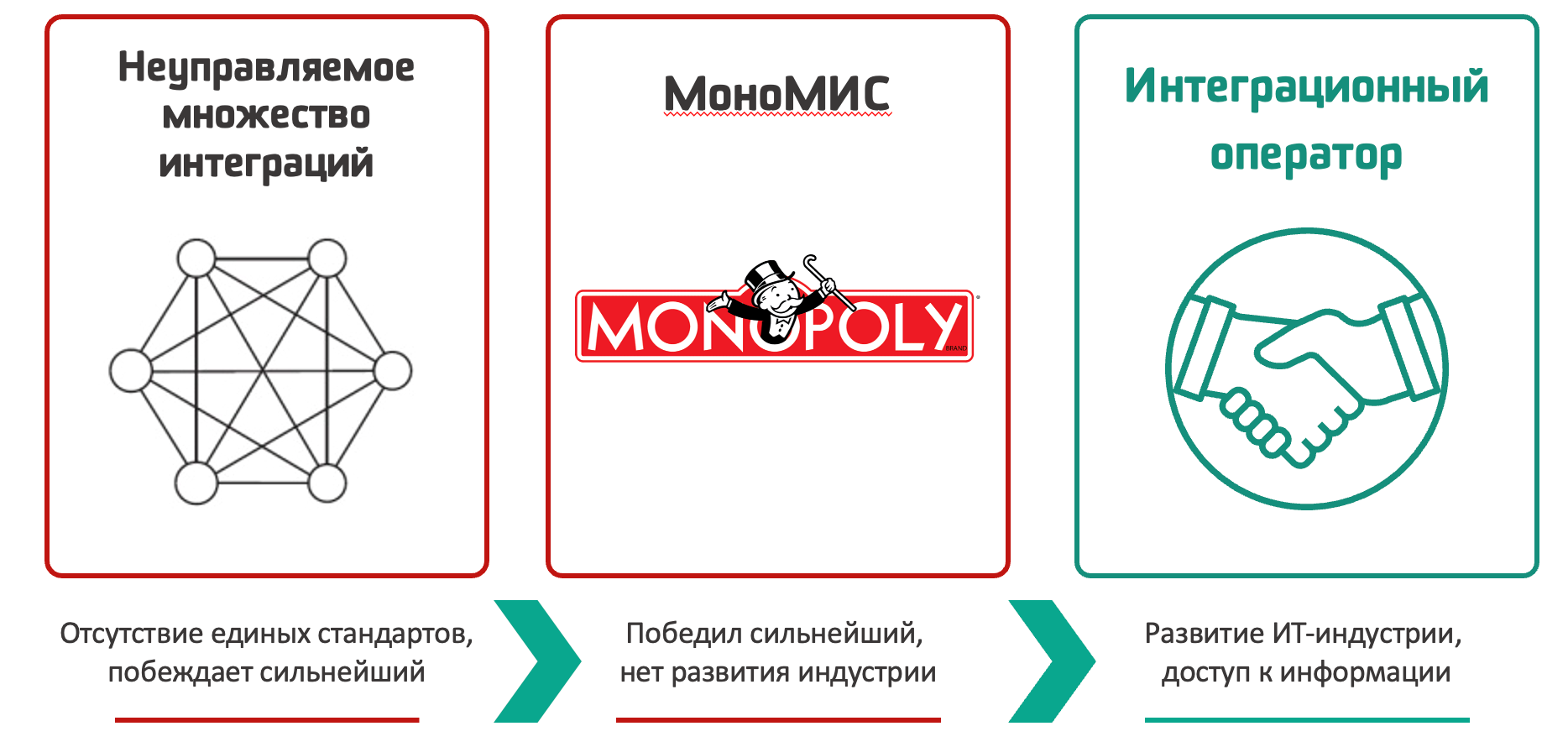 И наш опыт, и опыт коллег из разных стран мира (см. например, «Цифровое здравоохранение в Финляндии: плюсы интеграционного подхода» ) говорит о том, что информатизация здравоохранения неуклонно переходит от неуправляемого множества интеграций через моноМИС к архитектуре интеграционного оператора (см. рисунок).