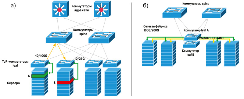 Рис. 4. Организация сети ЦОДа по схеме ToR (а) и MoR/EoR (б)