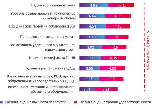 Рис. 1. Оценка важности параметров коммерческих ЦОДов и уровня удовлетворенности их показателями