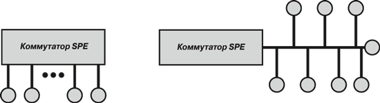 Рис. 4. Варианты подключения терминального оборудования к коммутатору SPE: слева традиционная, справа – по схеме шины или multidrop-структура