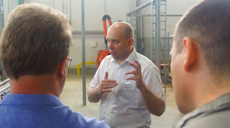 Добраться на машине до завода из Москвы — тот еще квест, без подсказок ведущего, сотрудника завода — труднопроходимый. Здание находится в чистом поле, съезд — малозаметная уложенная бетонными блоками дорога. Зато на территории завода — чистота и порядок. Да и само здание — большое, современное, вполне европейского уровня.