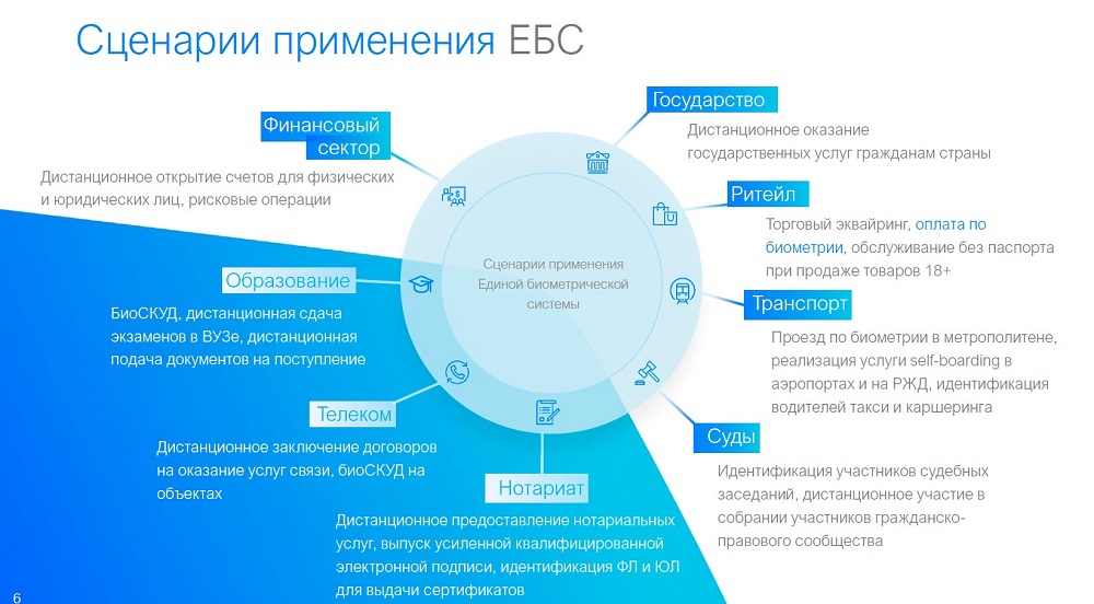 Помимо финансового сектора и госуслуг, биометрическая идентификация может использоваться, например, при дистанционной сдаче экзаменов, продаже спиртных напитков совершеннолетним, идентификации участников судебного заседания и водителей каршеринга, при дистанционном заключении договоров и предоставлении нотариальных услуг.