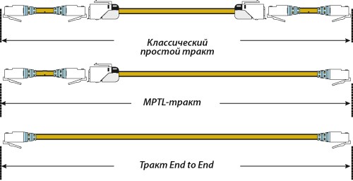 • вместо классических кабельных трактов формируются тракты MPTL (modular plug terminated link) или тракты прямого подключения (end to end, рис. 2);