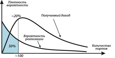 Рис. 3. Распределение числа реализуемых проектов структурированной проводки и зависимость получаемого дохода от количества портов кабельной системы