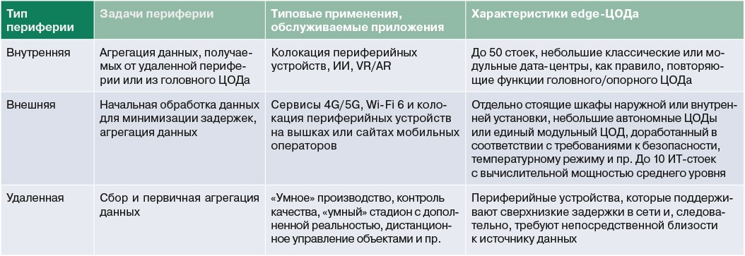 Критерием классификации периферийных дата-центров служат выполняемые ими функции или решаемые задачи, специфика обслуживаемых приложений/вычислений (см. таблицу).