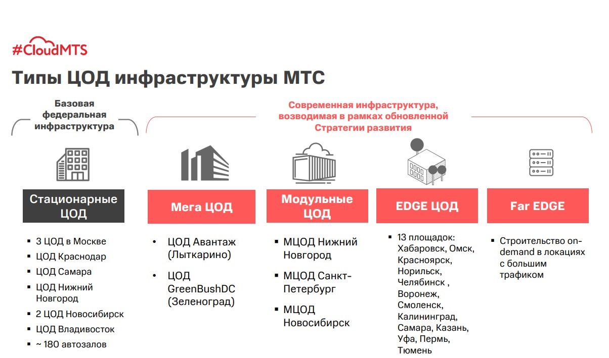 Сеть из подмосковных мегаЦОДов «Авантаж» в Лыткарине и GreeBushDC в Зеленограде, как сообщил директор по облачным продуктам #CloudMTS Михаил Соловьев, дополняется модульными ЦОДами в крупных региональных центрах (в промышленной эксплуатации уже находятся МЦОДы в Санкт-Петербурге, Нижнем Новгороде и Новосибирске), edge-ЦОДами в больших городах и совсем небольшими «дальними» Far Edge объектами в локациях с большим трафиком или в клиентских 5G- или LTE-проектах. На базе своей распределенной сети дата-центров МТС предоставляет бизнесу облачное решение, включающее развитую экосистему облачных сервисов и возможность создания частных облаков клиентов, причем на собственной системе виртуализации и облачной платформе.