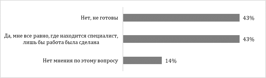 В сентябре 2022 г. мы провели собственное исследование среди клиентов, кандидатов и проектных ИТ-сотрудников, чтобы проанализировать, что изменилось на рынке ИT-специалистов. В рамках исследования мы задали вопрос работодателям, готовы ли они нанимать или привлекать к работе специалистов из других стран. Выяснилось, что 43% работодателей специалистов из других стран, включая уехавших из России, нанимать или привлекать к работе не готовы. Но другие 43%, наоборот, ответили, что для них не имеет значения, где находится специалист, главное – это выполненная работа.