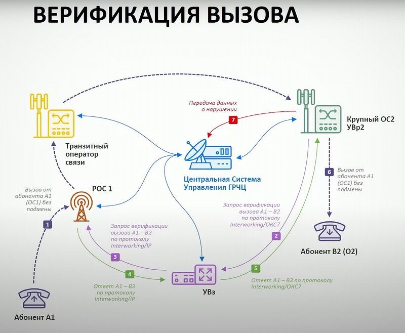 Чтобы построить маршрут прохождения вызова, ЦСУ в автоматическом режиме по цепочке запрашивает в обратную сторону от оператора вызываемого абонента все узлы верификации. Поскольку оборудование транзитных сетей в силу технических особенностей передает информацию о вызове в базы операторов с большой (но не превышающей 6 ч) задержкой, процедура опроса начинается через 6 ч. Место обрыва цепочки – точка входа нарушителя, подменившего номер. Данные об этом опять-таки в автоматическом режиме передаются в региональное отделение Роскомнадзора для выполнения контрольно-надзорных действий.