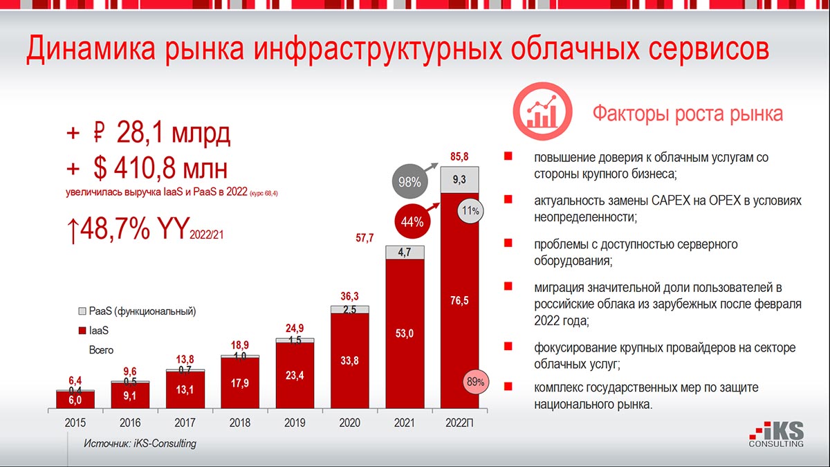 По предварительным данным iKS-Consulting, рынок инфраструктурных облачных сервисов в 2022 г. вырос на рекордные 48,7% (IaaS – 44%, PaaS – 98%), опередив самые оптимистичные прогнозы аналитиков. Сказались и повышение доверия к облачным сервисам, и геополитическая неопределенность. При проблемах с поставками зарубежного оборудования и сложностями планирования компании отдавали предпочтение сервисным моделям, увеличивая OPEX за счет CAPEХ. Другие факторы роста облаков – миграция значительной доли пользователей зарубежных сервисов на российские площадки и комплекс государственных мер по защите национального рынка. Уходящие зарубежные игроки передавали активы своим российским подразделениям, которым надо было срочно разворачивать ИТ-инфраструктуру, что в текущих условиях невозможно без использования ресурсов российских облачных провайдеров.