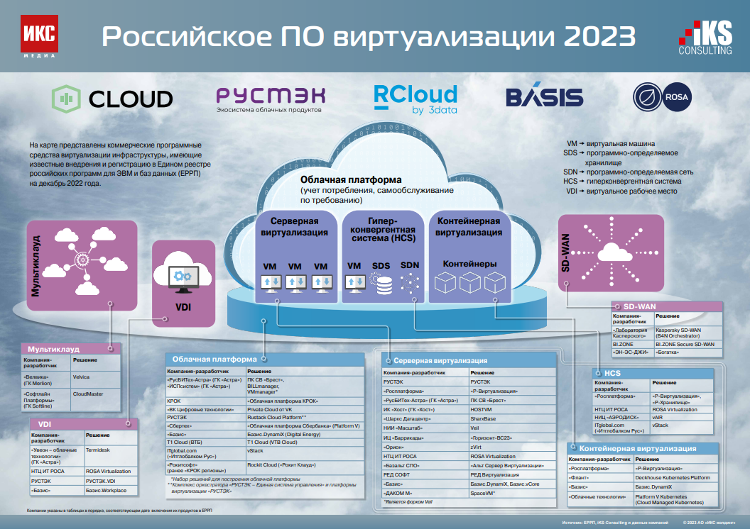 Делегаты конференции получили карту «Российское ПО виртуализации 2023» – новый уникальный продукт, разработанный iKS-Consulting. На карте не только перечислены, но и систематизированы российские решения для виртуализации и облачных платформ. Создана своего рода «таблица Менделеева» российских компаний, позволяющих заменить системы иностранных вендоров, в частности, той же VMware. Аналитики выбирали из не слишком хорошо структурированного и имеющего два классификатора Единого реестра российского программного обеспечения подходящие продукты, связывались с компаниями, выявляя, что и под каким брендом сейчас предлагается рынку, по возможности проверяли заявленный функционал и искали реальные внедрения.