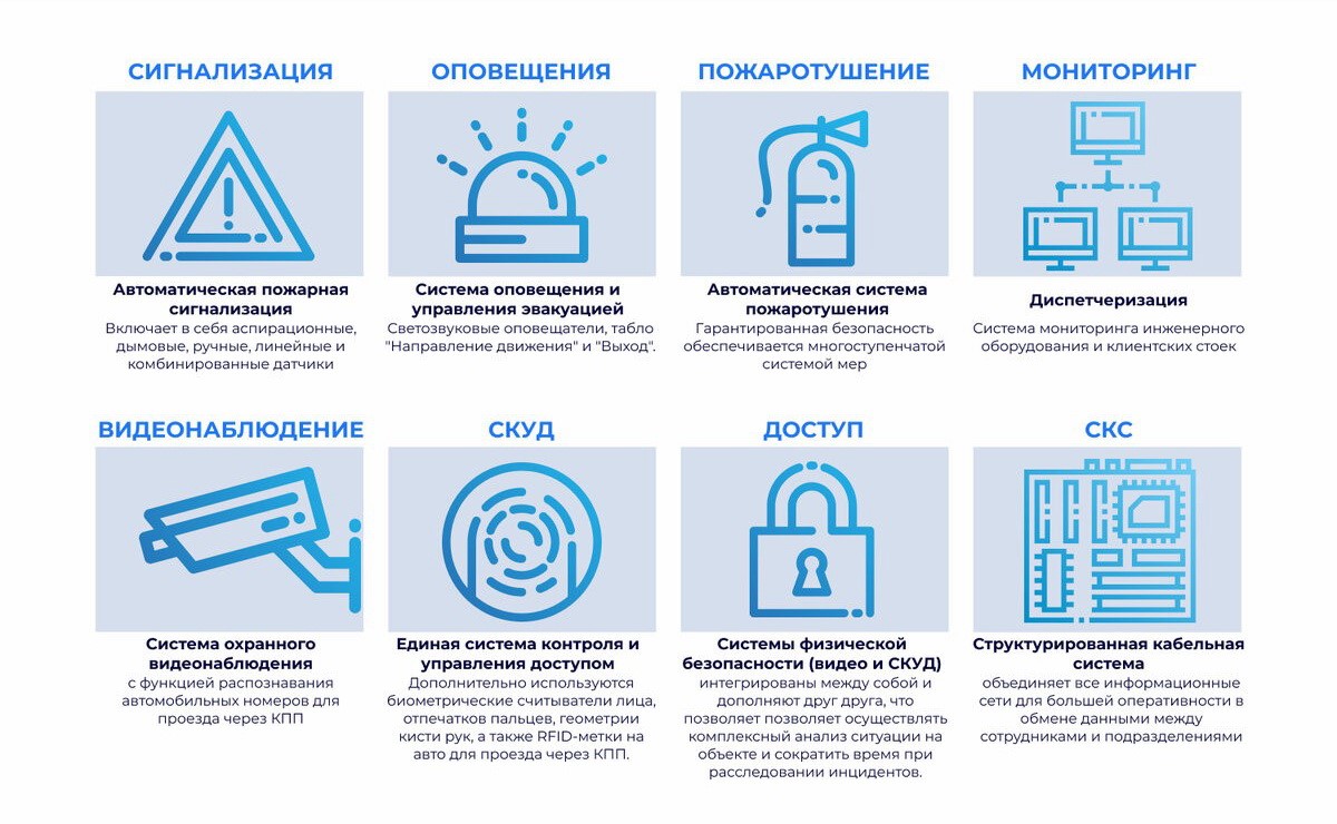 Системы физической безопасности (видео и СКУД) интегрированы между собой и дополняют друг друга, что позволяет осуществлять комплексный анализ ситуации на объекте и сократить время при расследовании инцидентов. Структурированная кабельная система (СКС) объединяет все информационные сети для большей оперативности в обмене данными между сотрудниками и подразделениями.