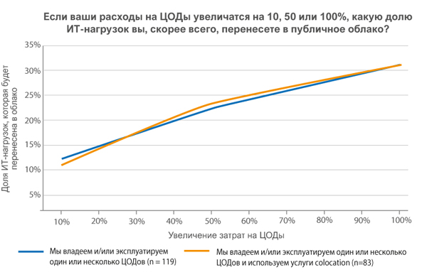 Рис. 1. Вероятная доля рабочих ИТ-нагрузок, которые будут перенесены в облако при росте затрат на ЦОДы