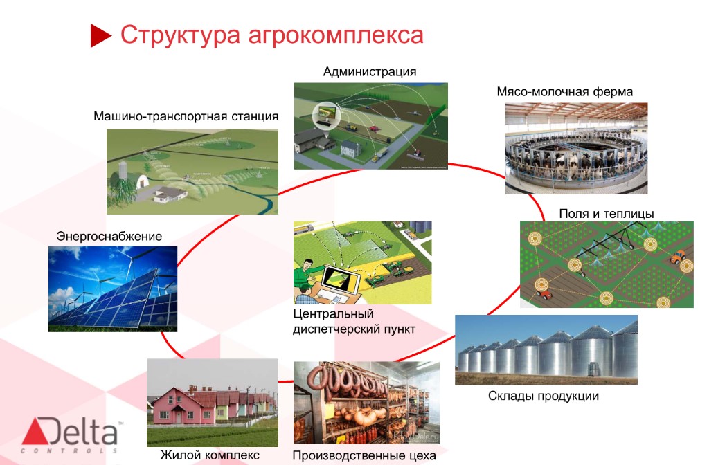 В структуру агрокомплекса входят не только птице- и мясо-молочные фермы, но и поля, теплицы, производственные цеха, склады, машинно-транспортные станции, системы энергоснабжения и полива.