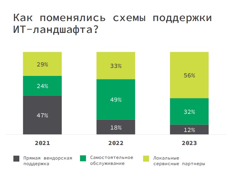 До событий 2022 г. на прямую вендорскую поддержку приходилось 47% сервисного обслуживания, что логично – кто как не поставщик лучше всего знает продукт и может быстро дать консультацию или провести ремонт. После ухода вендоров начали доминировать локальные сервисные партнеры, и это отрицательно сказалось на бизнесе – у двух третей опрошенных компаний стали случаться перебои в работе ИТ-инфраструктуры и бизнес-процессов.