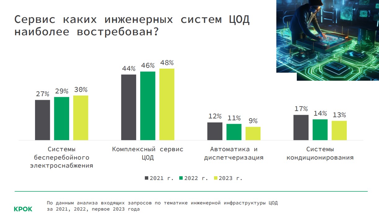 Восстанавливается спрос на поддержку инженерных систем дата-центров. «Многие клиенты, особенно владеющие объектами КИИ, не готовы к работе в облаке и генерируют запросы на создание собственных ЦОДов», – пояснил бум запросов на проектирование и строительство дата-центров Сергей Пауков, директор департамента инженерных и мультимедийных систем КРОК. В настоящее время компания участвует в более чем десяти проектах строительства крупных дата-центров, причем в двух региональных, за пределами столиц.