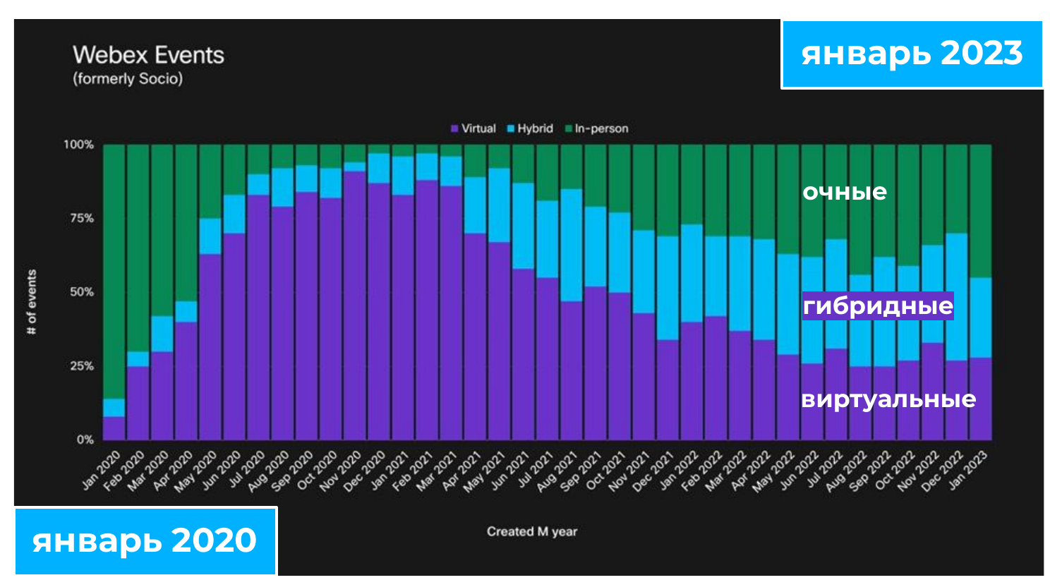 После окончания пандемии, по данным, которые привел директор по развитию компании TrueConf Дмитрий Одинцов, очный формат мероприятий отчасти восстановился, но его доля остается меньше половины. Зато почти треть мероприятий стала проводиться в гибридном формате (рис. 1). В качестве примера можно привести конференции «ИКС-Медиа», которые в разы увеличили число участников за счет подключения онлайн-слушателей. Да и само мероприятие «Видео + Конференции 2023», на котором обсуждались текущие проблемы видео-конференц-связи (ВКС), прошло в гибридном формате.