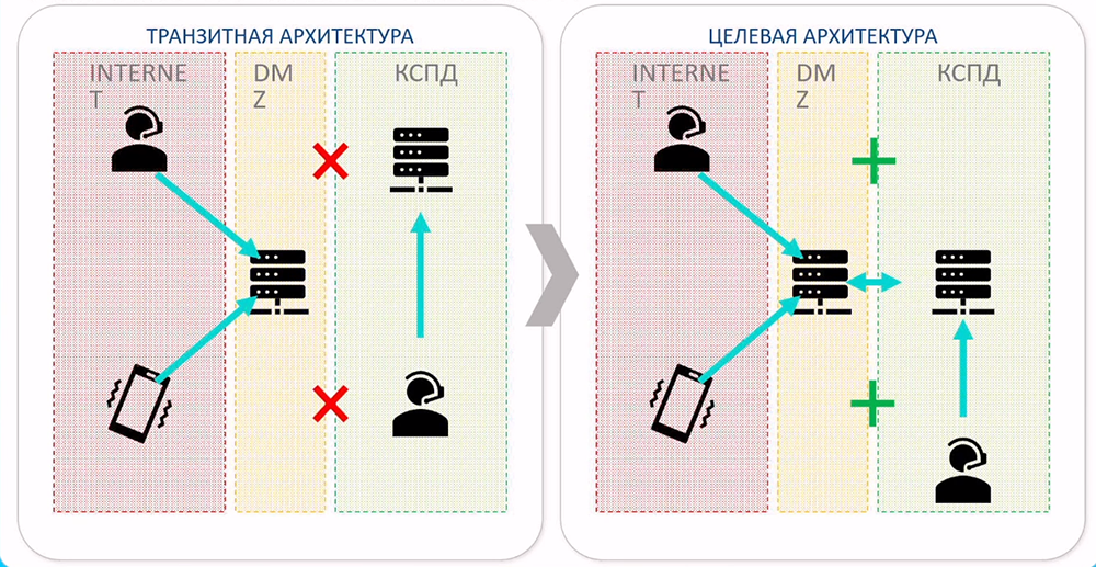 Внедрение ВКС в корпоративную сеть передачи данных (КСПД) стоит проводить постепенно. Например, в «Газпром нефти», по словам руководителя портфеля проектов импортозамещения Алексея Нефедова, сначала запустили транзитную архитектуру, не предусматривающую связь с пользователями в КСПД. Только внешние пользователи могли общаться через ВКС. И лишь после проработки всех вопросов обеспечения безопасности стали переходить на целевую архитектуру, связывающую внешних и внутренних пользователей.