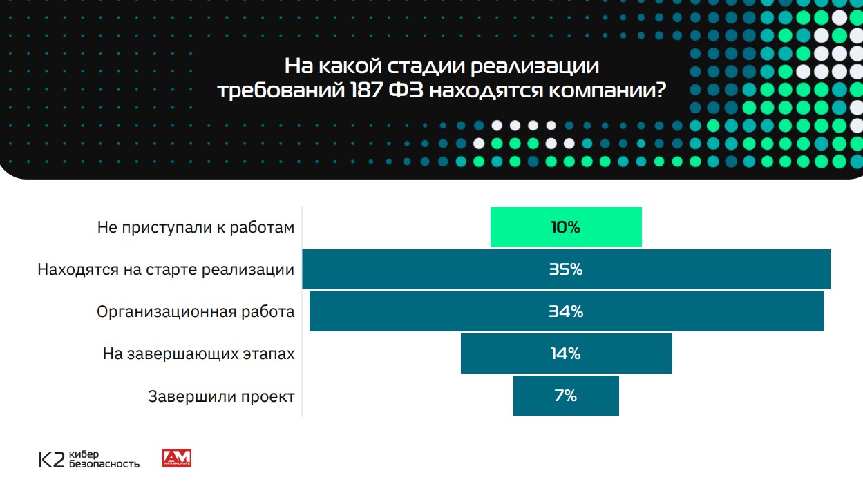 Такие данные получены в результате анонимного опроса ИТ- и ИБ-руководителей крупных российских предприятий и госкорпораций, проведенного совместно компаниями «К2 Кибербезопасность» и Anti-Malware.ru в ходе исследования готовности субъектов КИИ к исполнению закона № 187-ФЗ. При этом 10% компаний даже не начинали такую работу, хотя времени для реализации требований закона было достаточно.