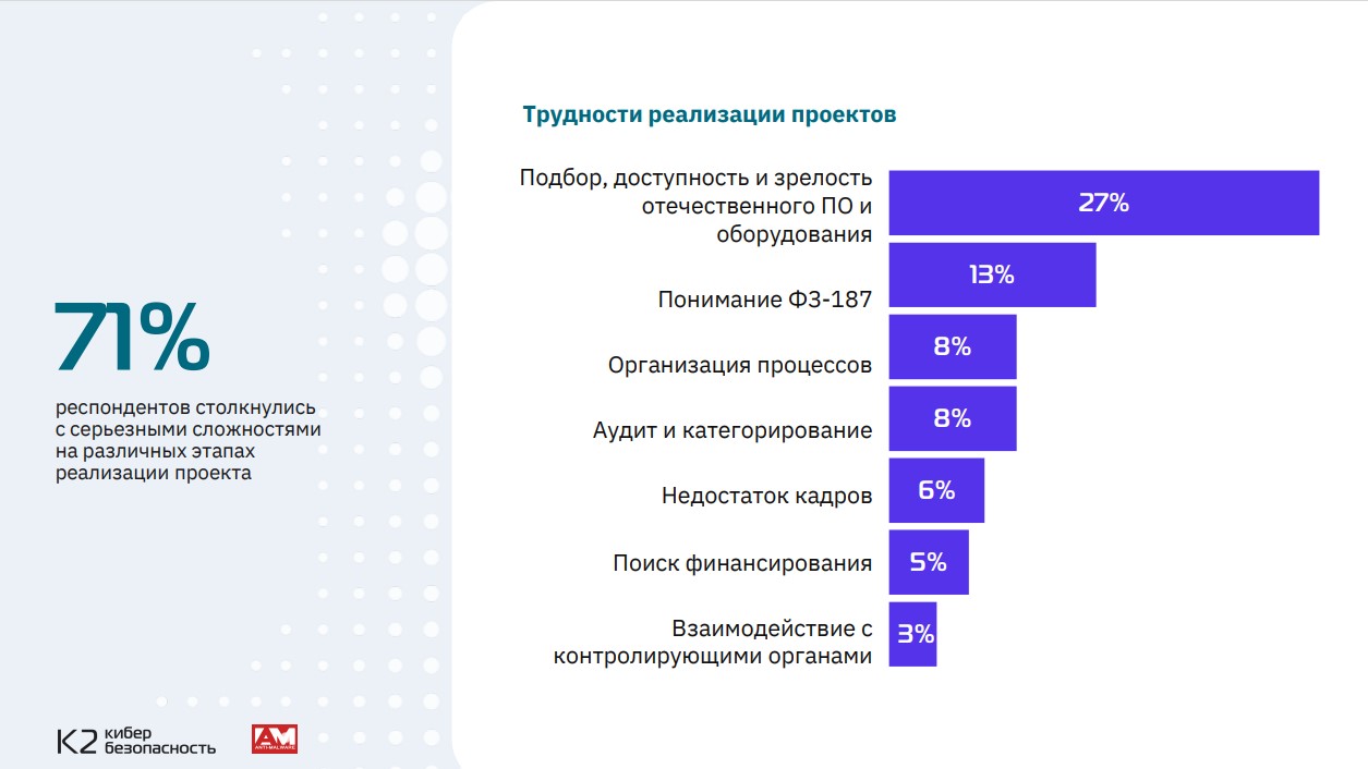 Причин много. Опрос показал, что главная проблема — трудность подбора зрелого отечественного ПО и оборудования. А использование иностранного ПО запрещает вышедший в марте 2022 г. указ президента № 166 («О мерах по обеспечению технологической независимости и безопасности критической информационной инфраструктуры РФ»). Под его действие подпадают практически все субъекты КИИ, осуществляющие закупки в соответствии с законом № 223-ФЗ «О закупках товаров, работ, услуг отдельными видами юридических лиц» для принадлежащих им значимых объектов КИИ. К таким организациям относятся бюджетные учреждения и компании с государственным участием, например, РЖД, «Газпром», «Роснефть». С 1 января 2025 г. им запрещается использовать средства защиты информации, произведенные в недружественных государствах либо организациями под их юрисдикцией, прямо или косвенно подконтрольными им либо аффилированными с ними.