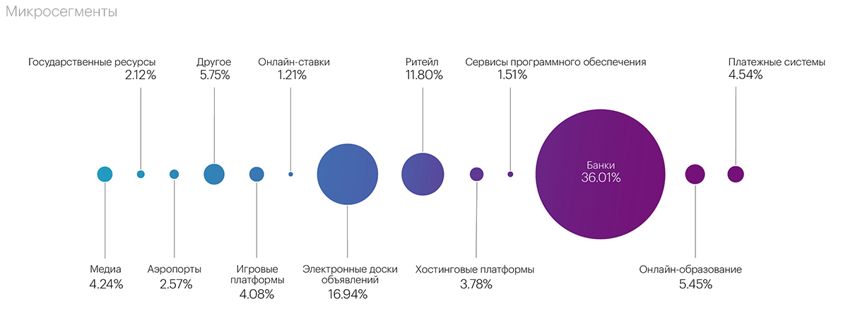 Сегменты беттинга и онлайн-ритейла находятся в топе у атакующих уже третий квартал подряд. В третьем квартале их доли составили 39,7% и 23,9% соответственно. Третье и четвертое место, как и в предыдущем периоде, заняли фармацевтика (9,5%) и финансовые организации (1,3%).
