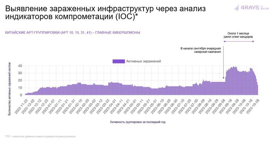 По данным телеметрии с крупнейшей в РФ сети сенсоров и ханипотов «Ростелекома», среди продвинутых группировок наиболее активными на территории РФ оказались хакеры из азиатского региона. В первую очередь это китайские группировки. Так, в сентябре 2023 года они запустили очередную кампанию с целью кибершпионажа – ежедневно вредоносным ПО заражалось от 20 до 40 систем российских организаций – и только спустя месяц злоумышленники были замечены вендорами средств защиты, после чего наметился спад их активности.