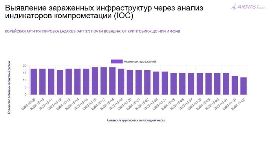 Также весьма активно действует на территории РФ северокорейская группировка Lazarus. За последние 2 года эксперты Solar 4RAYS расследовали несколько связанных с ней инцидентов. Среди жертв были, в частности, государственные органы власти. При этом анализ данных сенсоров показал, что на начало ноября хакеры Lazarus все еще имеют доступы к ряду российских систем.
