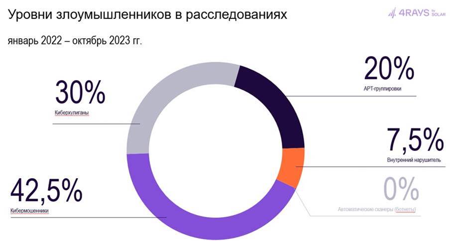 Большая часть расследуемых инцидентов связана с кибермошенниками (42,5%) – они обычно зарабатывают на взломах за счет шифрования, кражи и перепродажи данных. Второе место занимают киберхулиганы (30%), которые пытаются привлечь внимание через минимальное воздействие на ИТ-инфраструктуру, например – DDoS-атаки и дефейс сайтов. На третьем месте – профессиональные APT-группировки (20%).