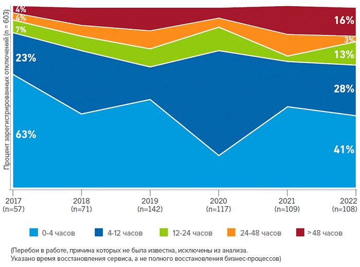 Чем дольше длится отключение, тем больше вероятность того, что его последствия будут дорогостоящими и разрушительными и оно привлечет внимание СМИ. Данные по публичным авариям показывают, что последствия большинства (70%) громких инцидентов устраняются в течение 12 ч, а многих гораздо быстрее. Однако начиная с 2019 г. (данные до этого года менее надежны) наблюдается тревожная тенденция: растет число отключений, полноценное восстановление после которых не удалось завершить даже через 48 ч.