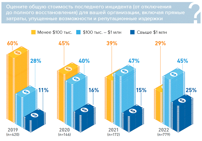 Данные, полученные нами в ходе исследований за несколько лет, ясно показывают, что простои обходятся все дороже. В глобальном опросе 2022 г. четверть респондентов заявили, что прямые и косвенные издержки их последнего отключения превысили $1 млн. Это подтверждает тенденцию к росту стоимости инцидентов (рис. 6). Еще 45% респондентов заявили, что последнее отключение обошлось им в сумму от $100 тыс. до $1 млн. Очевидно, аргументы в пользу увеличения инвестиций в отказоустойчивость (и обучение) становятся все более вескими.