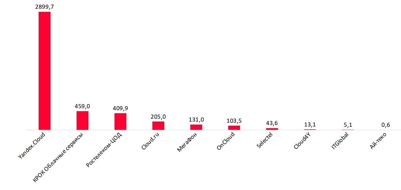 Сервис DВaaS интересен прежде всего компаниям, уже использующим облачные вычисления и хранящим данные в облаках. Например, в рамках сервиса Yandex Cloud с 2019 г. внешним пользователям доступна разработанная «Яндексом» открытая распределенная SQL-база данных YDB. Наличие этой СУБД помогло «Яндексу» с большим отрывом лидировать на российском рынке DBaaS (рис. 2).