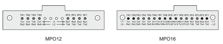 Рис. 2. Соответствие отдельных спектральных каналов посадочным местам вилки групповых наконечников MPO12 и MPO16