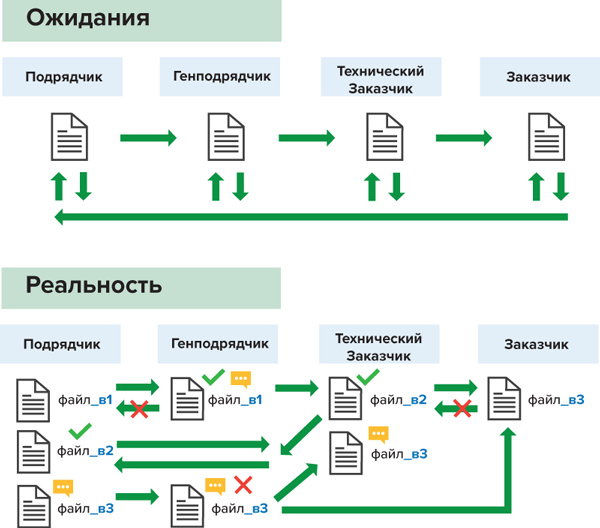 Рис. 2. Ожидаемое и реальное движение проектной информации между участниками проекта