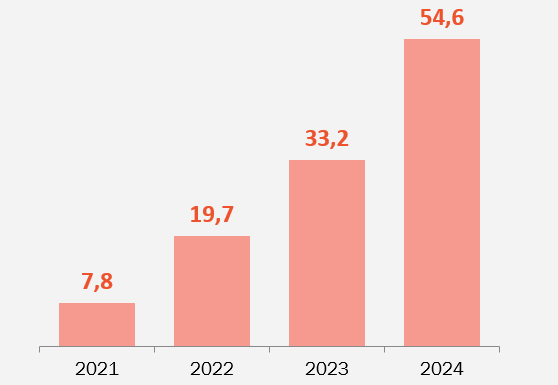 Что касается инфраструктурных облачных сервисов, то, по предварительным данным iKS-Consulting, в 2024 г. объем соответствующего рынка вырастет на 64,5% до уровня 54,6 млрд тенге (рис. 2). Это существенно больше объема рынка услуг коммерческих ЦОДов, главным образом colocation, который составит 31,6 млрд тенге. Два-три года назад ситуация была обратной: доходы от colocation превышали доходы от облачных сервисов.