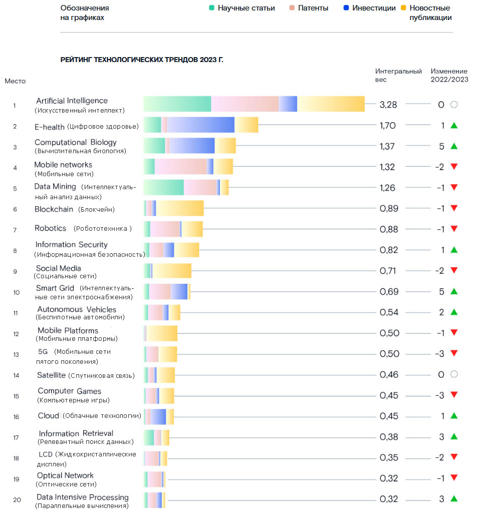 Искусственный интеллект стал главным глобальным трендом шестой год подряд. На второе место вышел диджитал в интересах здоровья (E-health), а на третьем – вычислительная биология (Computational biology), поднявшаяся в рейтинге сразу на пять строчек.