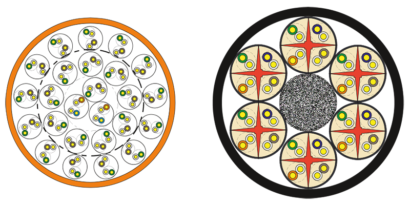 Многопарный кабель может выполняться по традиционной (рис. 1 а) и так называемой многоэлементной (рис. 1 б) схеме. Последняя конструкция фактически представляет собой сборку горизонтальных кабелей, объединенных в единую структуру дополнительной внешней оболочкой или обмоткой скрепляющими лентами.