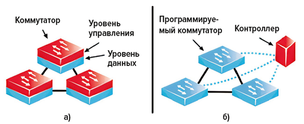Рис. 8. Традиционная (а) и программно определяемая (б) сетевая инфраструктура