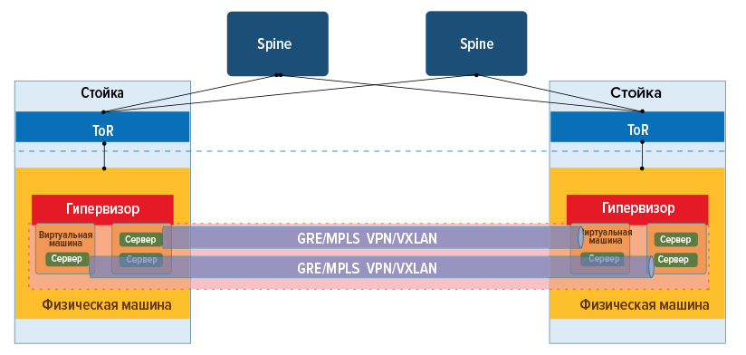 Необходимость обслуживать большое количество пользователей ограничивает применение VLAN, ведь их число в сети не может превышать 4096 и крупное облако на таком числе изолированных сетей не построишь. Требование отсутствия привязки виртуальных машин к их физическому расположению обусловливает применение работающих на уровнях L3 оверлейных сетей (GRE, MPLS VPN, VXLAN, GENEVE), имеющих возможность передавать пакеты через каналы с разными протоколами канального уровня (рис. 2).