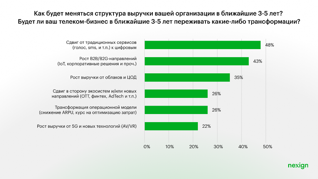 По результатам исследования, основными изменениями в структуре выручки телеком-бизнеса в ближайшие 3-5 лет респонденты называют переход от традиционных сервисов к цифровым (48%), рост b2b/b2g направлений (43%), увеличение выручки от облачных услуг и центров обработки данных (35%) и фокус на экосистемное развитие (26%). Такие же тренды наблюдаются на международном телеком-рынке: например, согласно отчету TM Forum, большинство операторов видит перспективы роста выручки именно в b2b-сегменте — в предоставлении облачных услуг, безопасности и профессиональных сервисов.