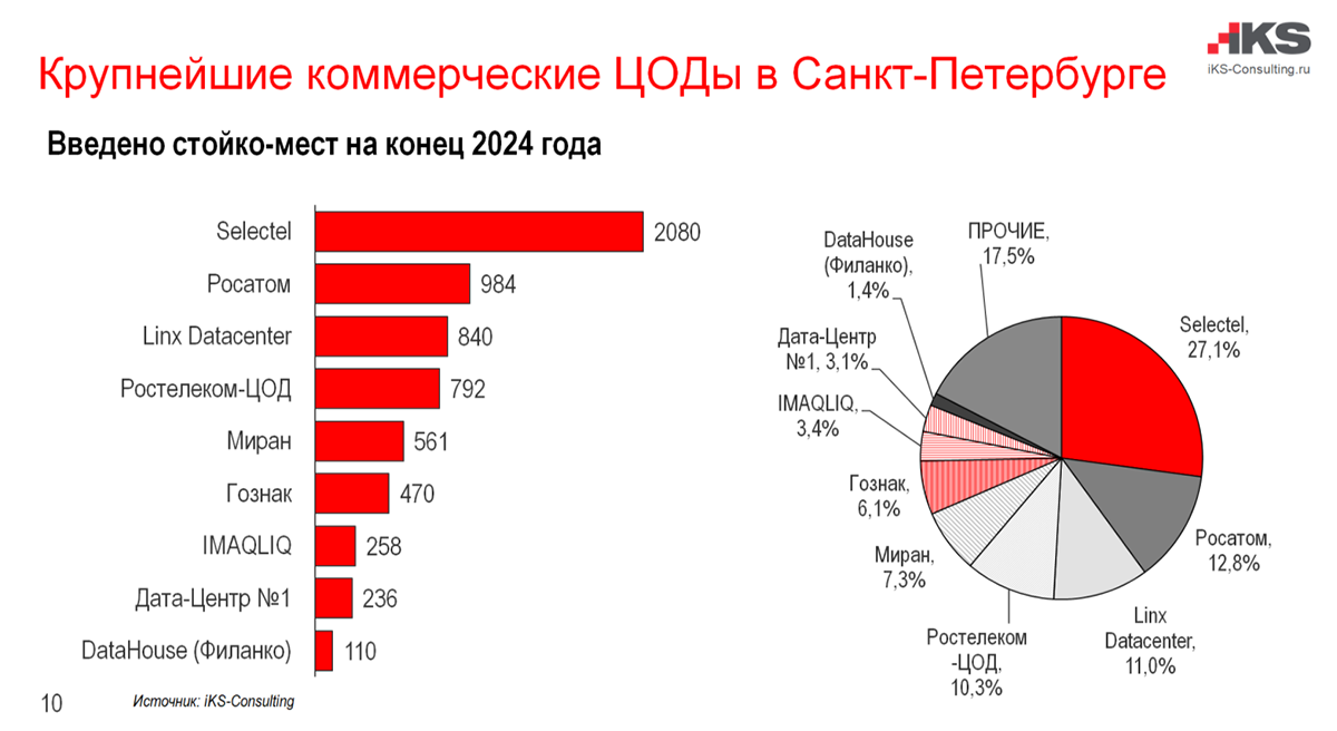 По числу стойко-мест в коммерческих дата-центрах СЗФО уступает только Москве. Крупнейшие коммерческие ЦОДы в регионе эксплуатируют Selectel (2080 стойко-мест), «Росатом» (984), Linx Datacenter (840) и «Ростелеком-ЦОД» («РТК-ЦОД») (792). Чуть отстают «Миран» (561) и «Гознак» (470).
